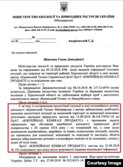 У вересні представники Мінекології України зверталися до ПрАТ «Юкрейніан кемікал Продактс» з проханням надати інформацію про виробничу діяльність її філії в Армянську, позаштатні ситуації та викиди забруднювальних речовин, починаючи з 20 серпня. Але в компанії повідомили «про відсутність можливості надання відповідної інформації», розповів заступник міністра екології та природних ресурсів України Віктор Вакараш.