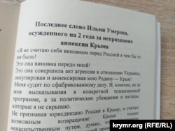 Показовою є щодо цього справа проти самого Ільмі Умерова. Він розповідає про неї в тексті «ФСБ «шиє справу» (стор. 87-91). Російські слідчі в розшифровці виступу Ільмі-аг'а по телебаченню в одній фразі додали від себе слово «треба», і весь текст став «закликом до порушення територіальної цілісності РФ». Цим «вставним» словом слідчі та «експерт» Ольга Іванова підвели обвинуваченого під статтю кримінального кодексу РФ. У результаті Сімферопольський районний суд виніс Ільмі Умерову вирок суворіший, ніж просив прокурор, хоча з міркувань гуманності суди зазвичай роблять навпаки. Але тільки не в Росії. А Ільмі Умеров роз’яснював, що він закликає не до порушення територіальної цілісності Росії, а навпаки – до відновлення територіальної цілісності і Росії, і України в їх законних межах шляхом повернення Криму Україні згідно з міжнародним правом і закликами ООН, статут якої порушила Росія.