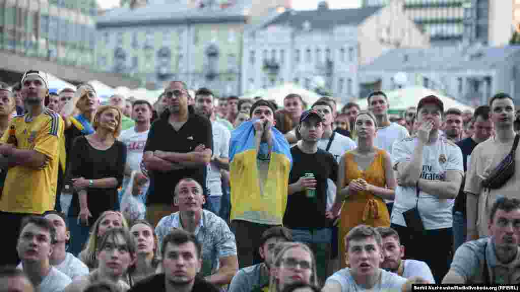 Збірна України поступилася в матчі групового турніру чемпіонату Європи з футболу. Українці програли команді Австрії з рахунком 0:1. Єдиний гол на рахунку Крістофа Баумгартнера. На 21-й хвилині він забив із кутового. Сльози та розпач вболівальників збірної України, які дивилися матч у фан-зоні на Спортивній площі у Києві, бачив фотокореспондент Радіо Свобода.